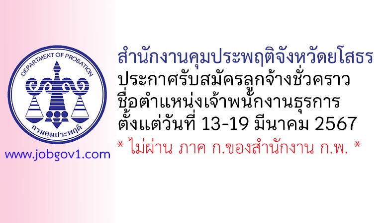 สำนักงานคุมประพฤติจังหวัดยโสธร รับสมัครลูกจ้างชั่วคราว ตำแหน่งเจ้าพนักงานธุรการ ตั้งแต่วันที่ 13-19 มีนาคม 2567