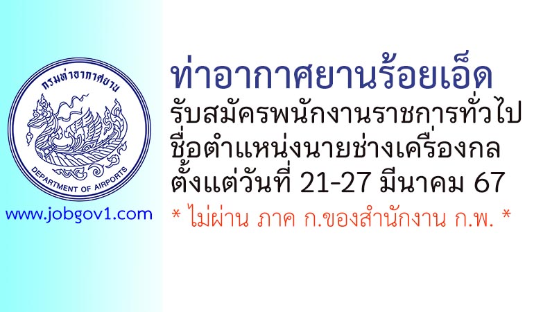 ท่าอากาศยานร้อยเอ็ด รับสมัครพนักงานราชการทั่วไป ตำแหน่งนายช่างเครื่องกล ตั้งแต่วันที่ 21-27 มีนาคม 2567