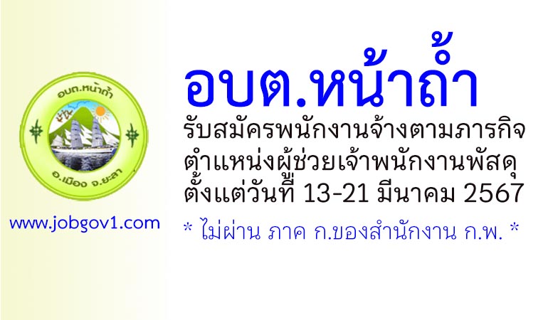 ประกาศองค์การบริหารส่วนตำบลหน้าถ้ำ เรื่อง รับสมัครบุคคลเพื่อสรรหาและเลือกสรรเป็นพนักงานจ้างตามภารกิจ องค์การบริหารส่วนตำบลหน้าถ้ำ อำเภอเมืองยะลา จังหวัดยะลา ประจำปีงบประมาณ พ.ศ. 2567
