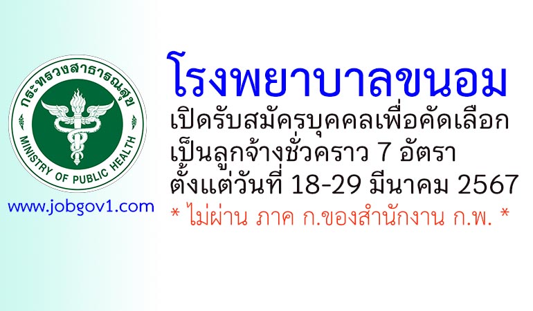 โรงพยาบาลขนอม รับสมัครบุคคลเพื่อคัดเลือกเป็นลูกจ้างชั่วคราว 7 อัตรา ตั้งแต่วันที่ 18-29 มีนาคม 2567
