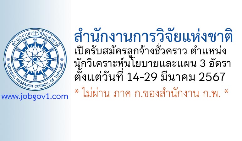 สำนักงานการวิจัยแห่งชาติ รับสมัครลูกจ้างชั่วคราว ตำแหน่งนักวิเคราะห์นโยบายและแผน 3 อัตรา ตั้งแต่วันที่ 14-29 มีนาคม 2567