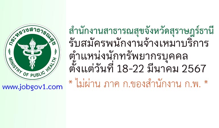 สำนักงานสาธารณสุขจังหวัดสุราษฎร์ธานี รับสมัครพนักงานจ้างเหมาบริการ ตำแหน่งนักทรัพยากรบุคคล ตั้งแต่วันที่ 18-22 มีนาคม 2567