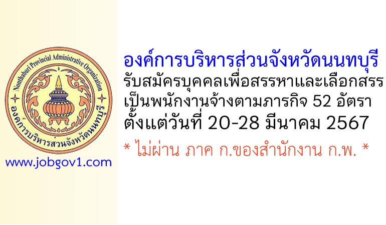 องค์การบริหารส่วนจังหวัดนนทบุรี รับสมัครบุคคลเพื่อสรรหาและเลือกสรรเป็นพนักงานจ้างตามภารกิจ 52 อัตรา ตั้งแต่วันที่ 20-28 มีนาคม 2567