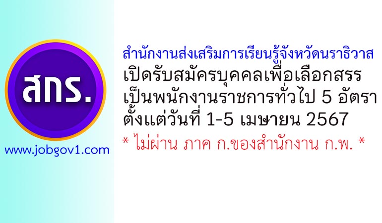 สำนักงานส่งเสริมการเรียนรู้จังหวัดนราธิวาส รับสมัครบุคคลเพื่อเลือกสรรเป็นพนักงานราชการทั่วไป 5 อัตรา ตั้งแต่วันที่ 1-5 เมษายน 2567