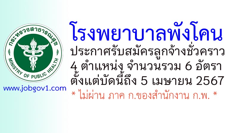 โรงพยาบาลพังโคน รับสมัครลูกจ้างชั่วคราว 4 ตำแหน่ง 6 อัตรา ตั้งแต่บัดนี้ถึง 5 เมษายน 2567