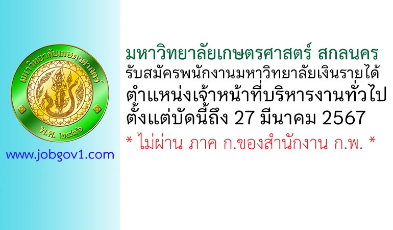 มหาวิทยาลัยเกษตรศาสตร์ สกลนคร รับสมัครพนักงานมหาวิทยาลัยเงินรายได้ ตำแหน่งเจ้าหน้าที่บริหารงานทั่วไป ตั้งแต่บัดนี้ถึง 27 มีนาคม 2567