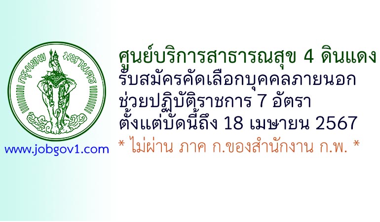 ศูนย์บริการสาธารณสุข 4 ดินแดง รับสมัครคัดเลือกบุคคลภายนอกช่วยปฏิบัติราชการ 7 อัตรา ตั้งแต่บัดนี้ถึง 18 เมษายน 2567