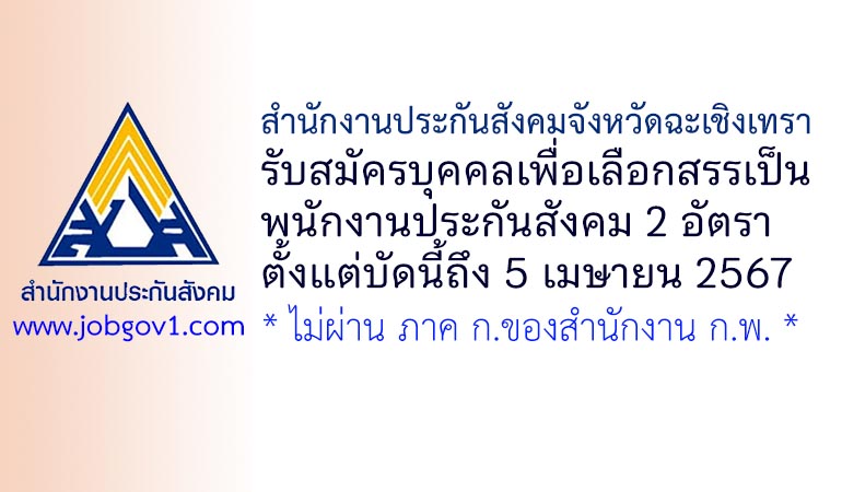 สำนักงานประกันสังคมจังหวัดฉะเชิงเทรา รับสมัครบุคคลเพื่อเลือกสรรเป็นพนักงานประกันสังคม 2 อัตรา ตั้งแต่บัดนี้ถึง 5 เมษายน 2567