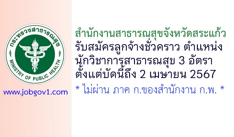 สำนักงานสาธารณสุขจังหวัดสระแก้ว รับสมัครลูกจ้างชั่วคราว ตำแหน่งนักวิชาการสาธารณสุข 3 อัตรา ตั้งแต่บัดนี้ถึง 2 เมษายน 2567