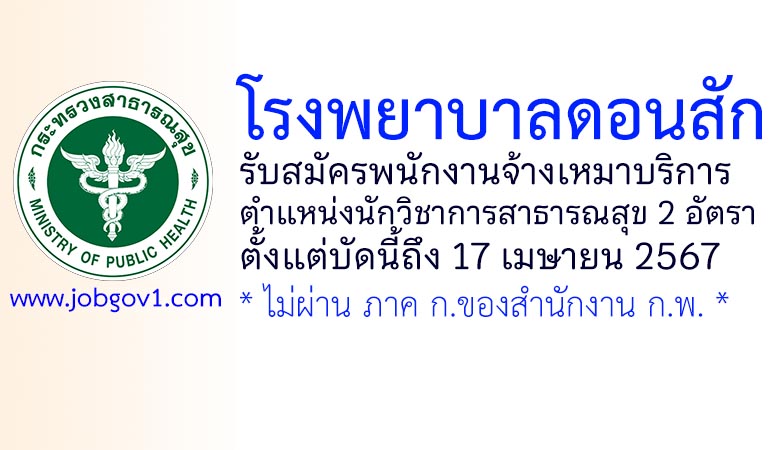 โรงพยาบาลดอนสัก รับสมัครพนักงานจ้างเหมาบริการ ตำแหน่งนักวิชาการสาธารณสุข 2 อัตรา ตั้งแต่บัดนี้ถึง 17 เมษายน 2567
