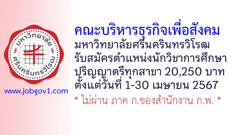 คณะบริหารธุรกิจเพื่อสังคม มหาวิทยาลัยศรีนครินทรวิโรฒ รับสมัครตำแหน่งนักวิชาการศึกษา ตั้งแต่วันที่ 1-30 เมษายน 2567
