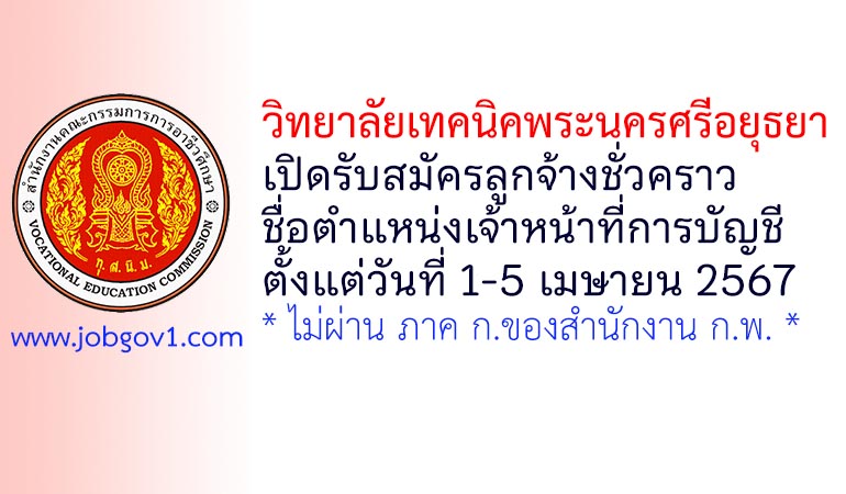 วิทยาลัยเทคนิคพระนครศรีอยุธยา รับสมัครลูกจ้างชั่วคราว ตำแหน่งเจ้าหน้าที่การบัญชี ตั้งแต่วันที่ 1-5 เมษายน 2567
