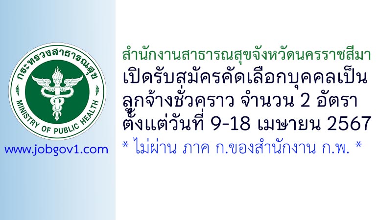 สำนักงานสาธารณสุขจังหวัดนครราชสีมา รับสมัครคัดเลือกบุคคลเป็นลูกจ้างชั่วคราว 2 อัตรา ตั้งแต่วันที่ 9-18 เมษายน 2567