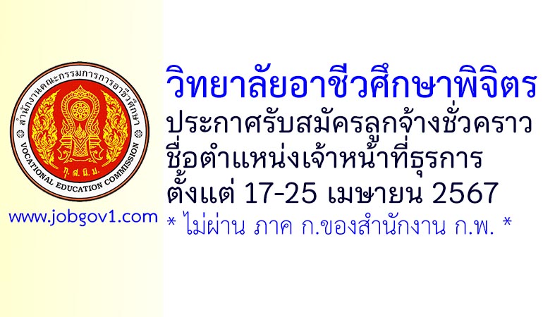 วิทยาลัยอาชีวศึกษาพิจิตร รับสมัครลูกจ้างชั่วคราว ตำแหน่งเจ้าหน้าที่ธุรการ ตั้งแต่วันที่ 17-25 เมษายน 2567