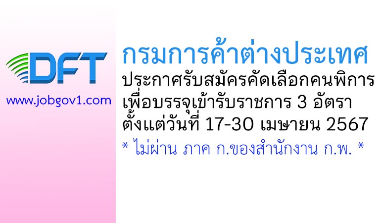 กรมการค้าต่างประเทศ รับสมัครคัดเลือกคนพิการเพื่อบรรจุเข้ารับราชการ 3 อัตรา ตั้งแต่วันที่ 17-30 เมษายน 2567