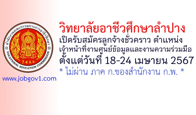 วิทยาลัยอาชีวศึกษาลำปาง รับสมัครลูกจ้างชั่วคราว ตำแหน่งเจ้าหน้าที่งานศูนย์ข้อมูลและงานความร่วมมือ ตั้งแต่วันที่ 18-24 เมษายน 2567