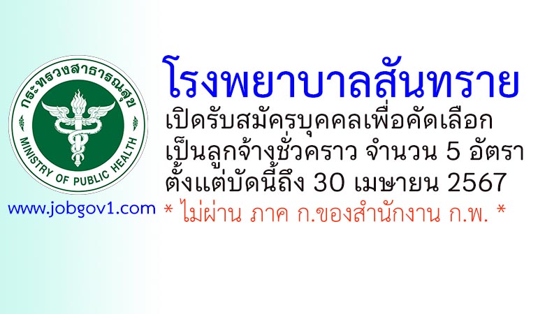 โรงพยาบาลสันทราย รับสมัครบุคคลเพื่อคัดเลือกเป็นลูกจ้างชั่วคราว 5 อัตรา ตั้งแต่บัดนี้ถึง 30 เมษายน 2567
