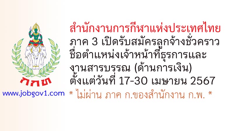 สำนักงานการกีฬาแห่งประเทศไทย ภาค 3 รับสมัครลูกจ้างชั่วคราว ตำแหน่งเจ้าหน้าที่ธุรการและงานสารบรรณ (ด้านการเงิน) ตั้งแต่วันที่ 17-30 เมษายน 2567