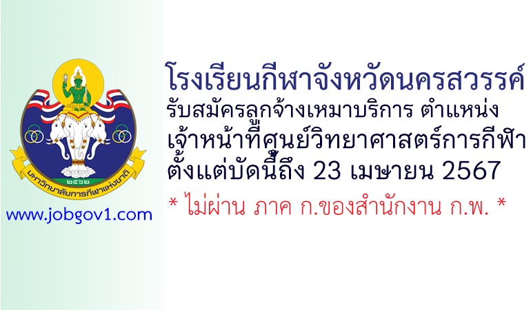 โรงเรียนกีฬาจังหวัดนครสวรรค์ รับสมัครลูกจ้างเหมาบริการ ตำแหน่งเจ้าหน้าที่ศูนย์วิทยาศาสตร์การกีฬา ตั้งแต่บัดนี้ถึง 23 เมษายน 2567