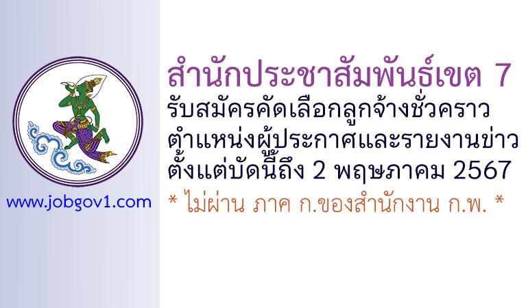 สำนักประชาสัมพันธ์เขต 7 รับสมัครลูกจ้างชั่วคราว ตำแหน่งผู้ประกาศและรายงานข่าว ตั้งแต่บัดนี้ถึง 2 พฤษภาคม 2567