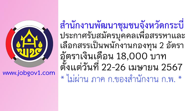สำนักงานพัฒนาชุมชนจังหวัดกระบี่ รับสมัครบุคคลเพื่อสรรหาและเลือกสรรเป็นพนักงานกองทุน 2 อัตรา ตั้งแต่วันที่ 22-26 เมษายน 2567