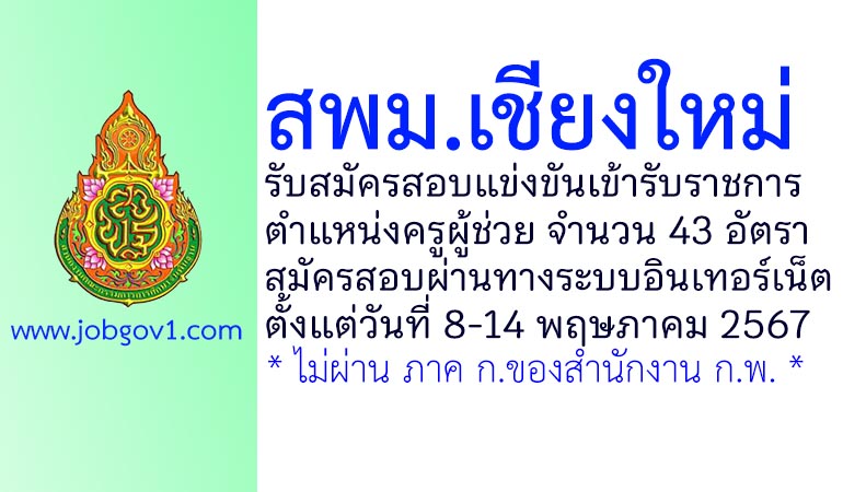 สพม.เชียงใหม่ รับสมัครสอบแข่งขันเข้ารับราชการ ตำแหน่งครูผู้ช่วย 43 อัตรา ตั้งแต่วันที่ 8-14 พฤษภาคม 2567