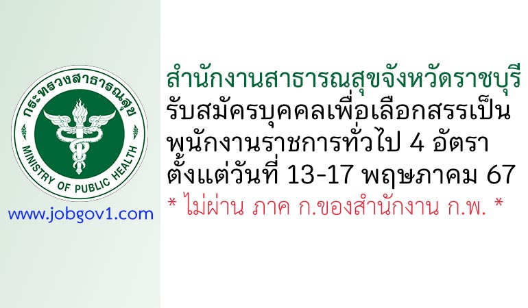 สำนักงานสาธารณสุขจังหวัดราชบุรี รับสมัครบุคคลเพื่อเลือกสรรเป็นพนักงานราชการทั่วไป 4 อัตรา ตั้งแต่วันที่ 13-17 พฤษภาคม 2567
