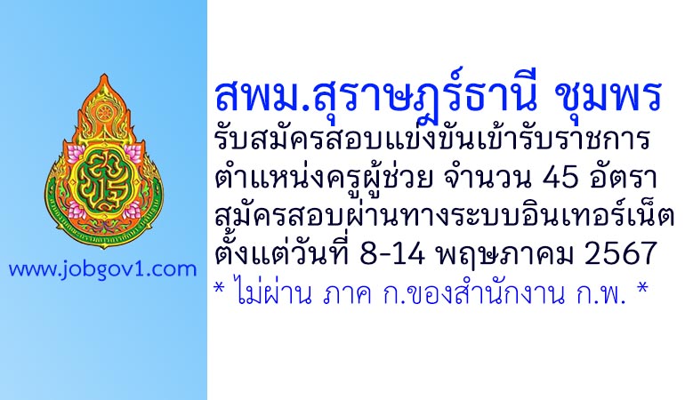 สพม.สุราษฎร์ธานี ชุมพร รับสมัครสอบแข่งขันเข้ารับราชการ ตำแหน่งครูผู้ช่วย 45 อัตรา ตั้งแต่วันที่ 8-14 พฤษภาคม 2567