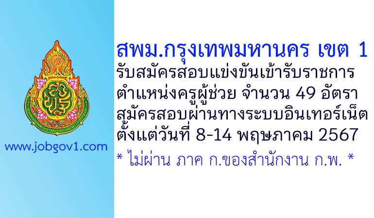 สพม.กรุงเทพมหานคร เขต 1 รับสมัครสอบแข่งขันเข้ารับราชการ ตำแหน่งครูผู้ช่วย 49 อัตรา ตั้งแต่วันที่ 8-14 พฤษภาคม 2567