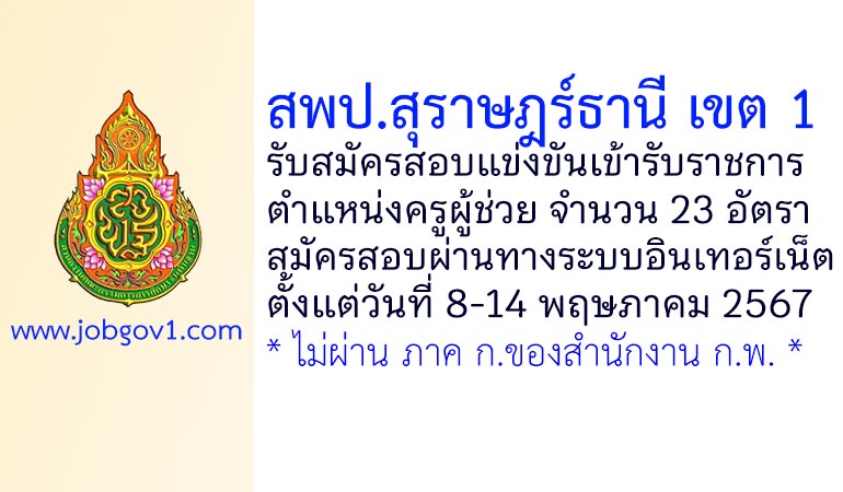 ประกาศ อ.ก.ค.ศ. เขตพื้นที่การศึกษาประถมศึกษาสุราษฎร์ธานี เขต 1 เรื่อง รับสมัครสอบแข่งขันเพื่อบรรจุและแต่งตั้งบุคคลเข้ารับราชการเป็นข้าราชการครูและบุคลากรทางการศึกษา ตำแหน่งครูผู้ช่วย สังกัดสำนักงานคณะกรรมการการศึกษาขั้นพื้นฐาน ปี พ.ศ. 2567
