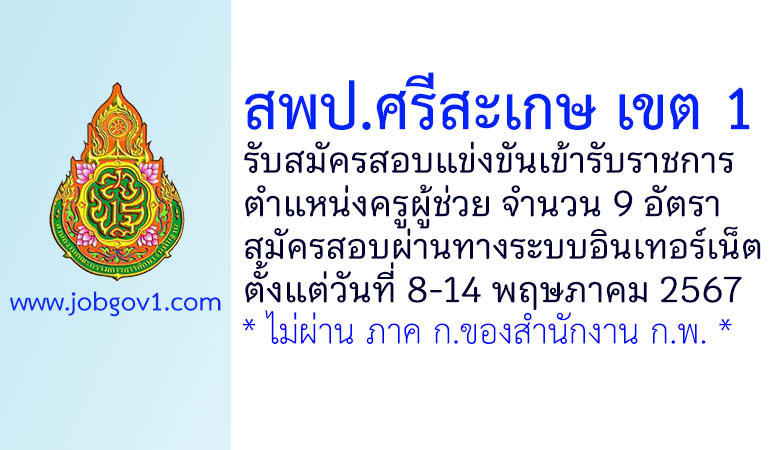 ประกาศ อ.ก.ค.ศ.เขตพื้นที่การศึกษาประถมศึกษาศรีสะเกษ เขต 1 เรื่อง รับสมัครสอบแข่งขันเพื่อบรรจุและแต่งตั้งบุคคลเข้ารับราชการเป็นข้าราชการครูและบุคลากรทางการศึกษา ตำแหน่งครูผู้ช่วย สังกัดสำนักงานคณะกรรมการการศึกษาขั้นพื้นฐาน ปี พ.ศ. 2567