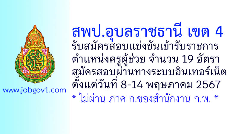 ประกาศ อ.ก.ค.ศ. เขตพื้นที่การศึกษาประถมศึกษาอุบลราชธานี เขต 4 เรื่อง รับสมัครสอบแข่งขันเพื่อบรรจุและแต่งตั้งบุคคลเข้ารับราชการเป็นข้าราชการครูและบุคลากรทางการศึกษา ตำแหน่งครูผู้ช่วย สังกัดสำนักงานคณะกรรมการการศึกษาขั้นพื้นฐาน ปี พ.ศ. 2567