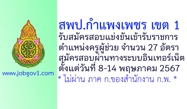 ประกาศ อ.ก.ค.ศ. เขตพื้นที่การศึกษาประถมศึกษากำแพงเพชร เขต 1 เรื่อง รับสมัครสอบแข่งขันเพื่อบรรจุและแต่งตั้งบุคคลเข้ารับราชการเป็นข้าราชการครูและบุคลากรทางการศึกษา ตำแหน่งครูผู้ช่วย สังกัดสำนักงานคณะกรรมการการศึกษาขั้นพื้นฐาน ปี พ.ศ. 2567