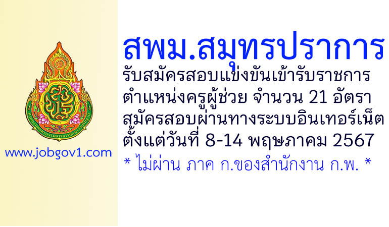 สพม.สมุทรปราการ รับสมัครสอบแข่งขันเข้ารับราชการ ตำแหน่งครูผู้ช่วย 21 อัตรา ตั้งแต่วันที่ 8-14 พฤษภาคม 2567
