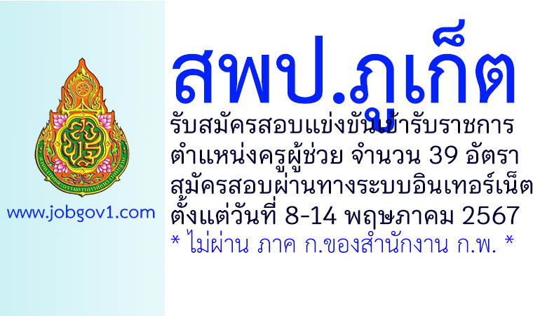 สพป.ภูเก็ต รับสมัครสอบแข่งขันเข้ารับราชการ ตำแหน่งครูผู้ช่วย 39 อัตรา ตั้งแต่วันที่ 8-14 พฤษภาคม 2567