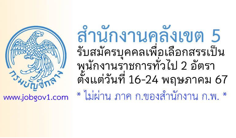 สำนักงานคลังเขต 5 รับสมัครบุคคลเพื่อเลือกสรรเป็นพนักงานราชการทั่วไป 2 อัตรา ตั้งแต่วันที่ 16-24 พฤษภาคม 2567