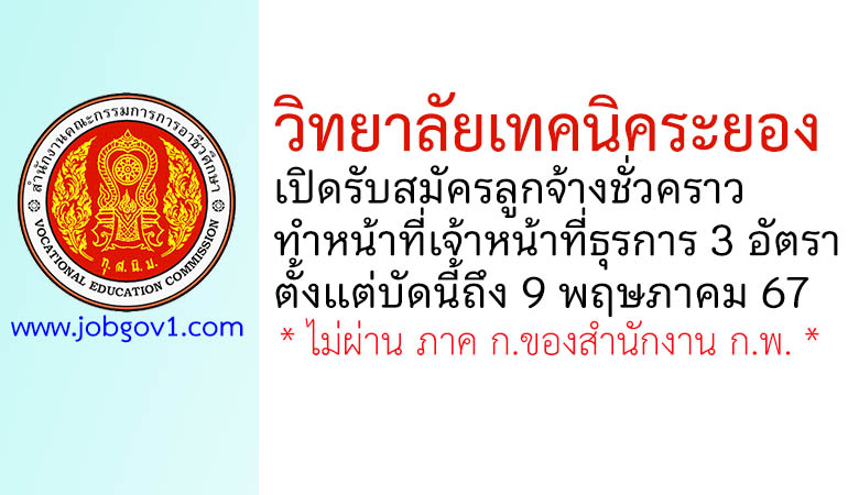 วิทยาลัยเทคนิคระยอง รับสมัครลูกจ้างชั่วคราว ทำหน้าที่เจ้าหน้าที่ธุรการ 3 อัตรา ตั้งแต่บัดนี้ถึง 9 พฤษภาคม 2567