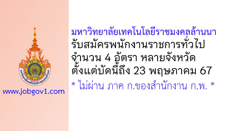 มหาวิทยาลัยเทคโนโลยีราชมงคลล้านนา รับสมัครบุคคลเพื่อเลือกสรรเป็นพนักงานราชการทั่วไป 4 อัตรา ตั้งแต่วันที่ 9-23 พฤษภาคม 2567