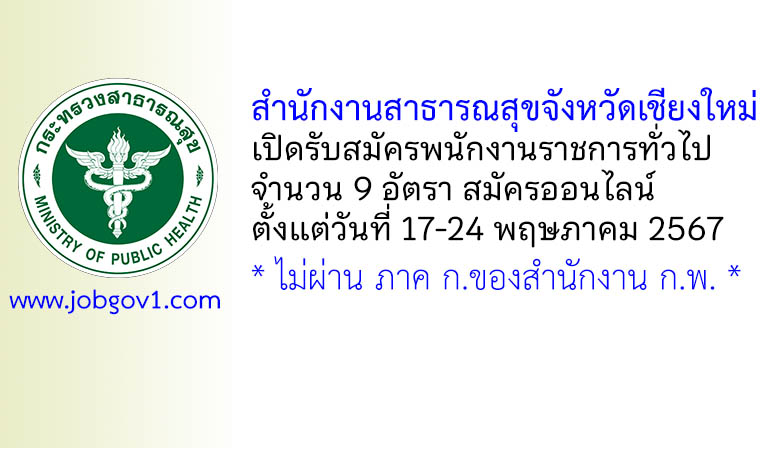 สำนักงานสาธารณสุขจังหวัดเชียงใหม่ รับสมัครบุคคลเพื่อเลือกสรรเป็นพนักงานราชการทั่วไป 9 อัตรา ตั้งแต่วันที่ 17-24 พฤษภาคม 2567