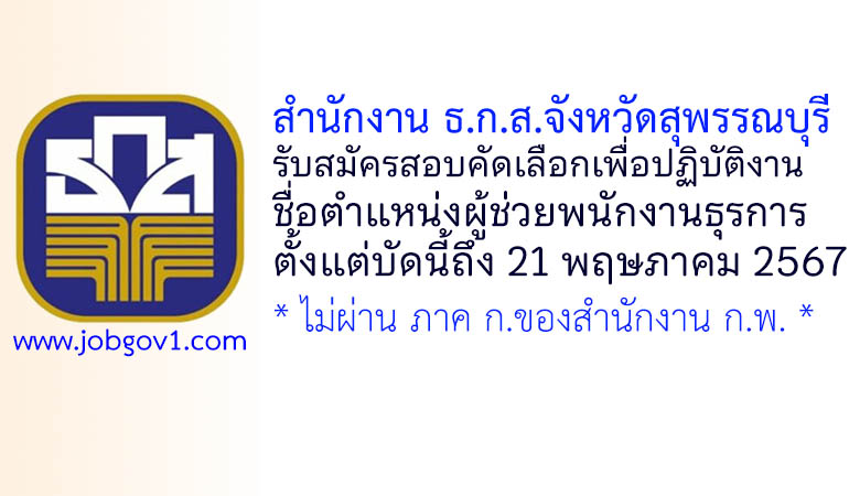 สำนักงาน ธ.ก.ส.จังหวัดสุพรรณบุรี รับสมัครสอบคัดเลือกเพื่อปฏิบัติงาน ตำแหน่งผู้ช่วยพนักงานธุรการ ตั้งแต่วันที่ 8-21 พฤษภาคม 2567