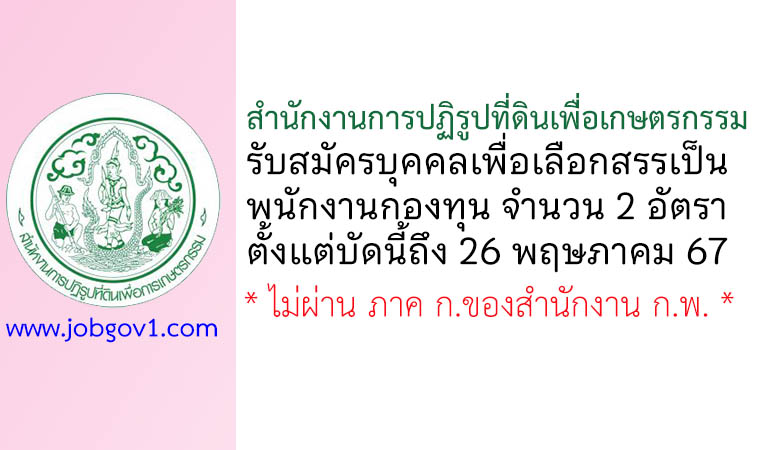 สำนักงานการปฏิรูปที่ดินเพื่อเกษตรกรรม รับสมัครบุคคลเพื่อเลือกสรรเป็นพนักงานกองทุน 2 อัตรา ตั้งแต่บัดนี้ถึง 26 พฤษภาคม 2567