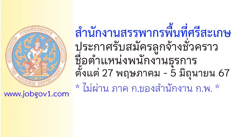 ประกาศสำนักงานสรรพากรพื้นที่ศรีสะเกษ เรื่อง รับสมัครสอบคัดเลือกเป็นลูกจ้างชั่วคราว ตำแหน่ง พนักงานธุรการ