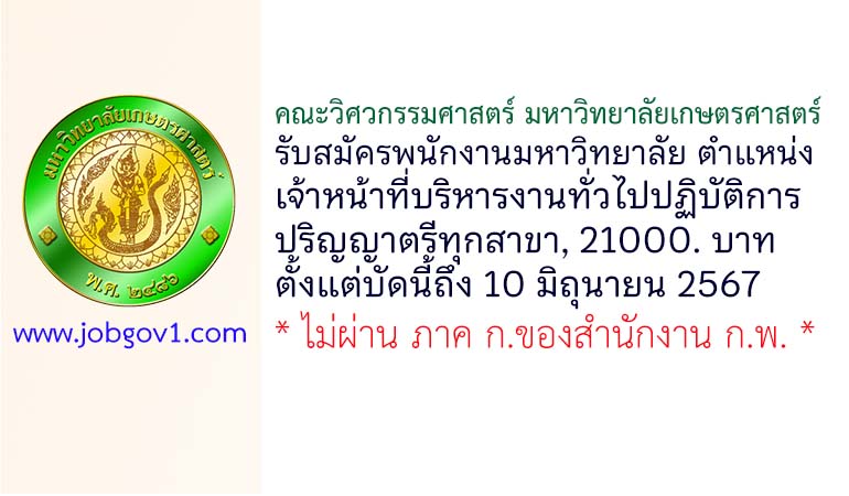 คณะวิศวกรรมศาสตร์ มหาวิทยาลัยเกษตรศาสตร์ รับสมัครพนักงานมหาวิทยาลัย ตำแหน่งเจ้าหน้าที่บริหารงานทั่วไปปฏิบัติการ ตั้งแต่บัดนี้ถึง 10 มิถุนายน 2567
