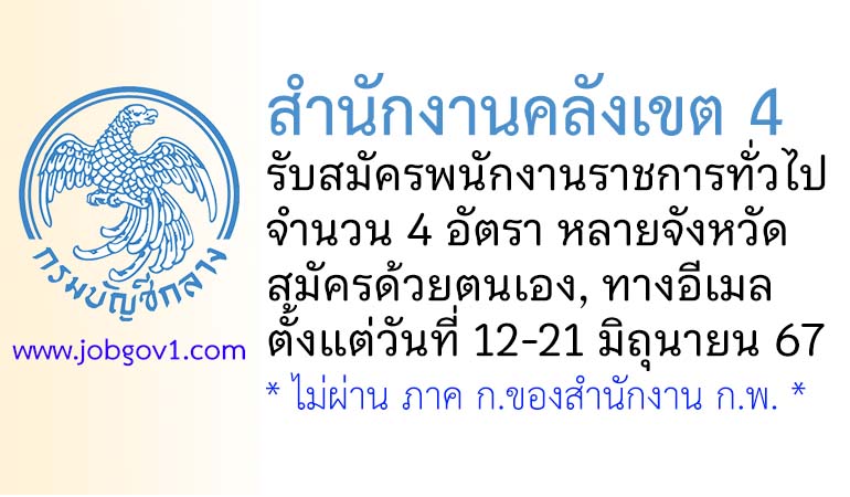 สำนักงานคลังเขต 4 รับสมัครบุคคลเพื่อเลือกสรรเป็นพนักงานราชการทั่วไป 4 อัตรา ตั้งแต่วันที่ 12-21 มิถุนายน 2567