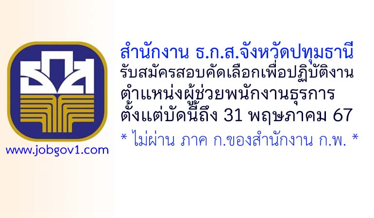สำนักงาน ธ.ก.ส.จังหวัดปทุมธานี รับสมัครสอบคัดเลือกเพื่อปฏิบัติงาน ตำแหน่งผู้ช่วยพนักงานธุรการ ตั้งแต่วันที่ 16-31 พฤษภาคม 2567