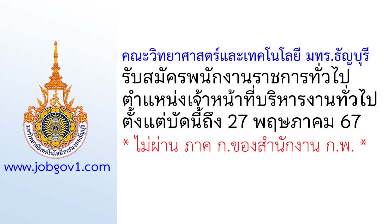 คณะวิทยาศาสตร์และเทคโนโลยี มทร.ธัญบุรี รับสมัครพนักงานราชการทั่วไป ตำแหน่งเจ้าหน้าที่บริหารงานทั่วไป ตั้งแต่วันที่ 13-27 พฤษภาคม 2567