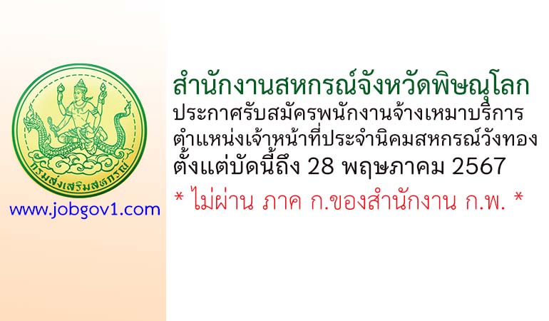 สำนักงานสหกรณ์จังหวัดพิษณุโลก รับสมัครพนักงานจ้างเหมาบริการ ตำแหน่งเจ้าหน้าที่ประจำนิคมสหกรณ์วังทอง ตั้งแต่บัดนี้ถึง 28 พฤษภาคม 2567