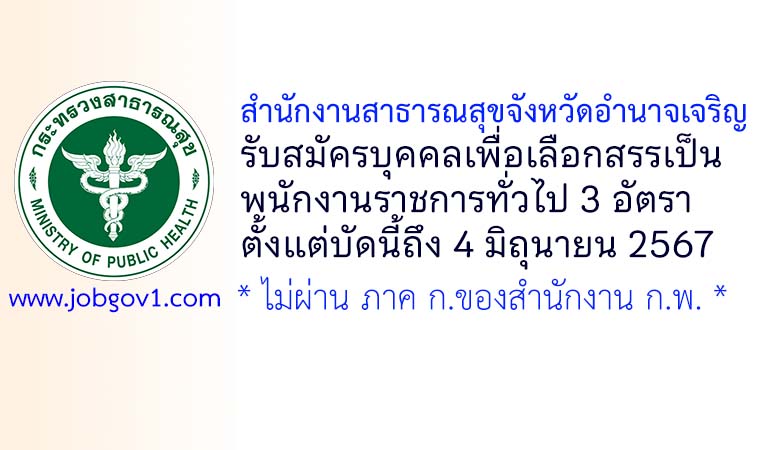 สำนักงานสาธารณสุขจังหวัดอำนาจเจริญ รับสมัครบุคคลเพื่อเลือกสรรเป็นพนักงานราชการทั่วไป 3 อัตรา ตั้งแต่บัดนี้ถึง 4 มิถุนายน 2567