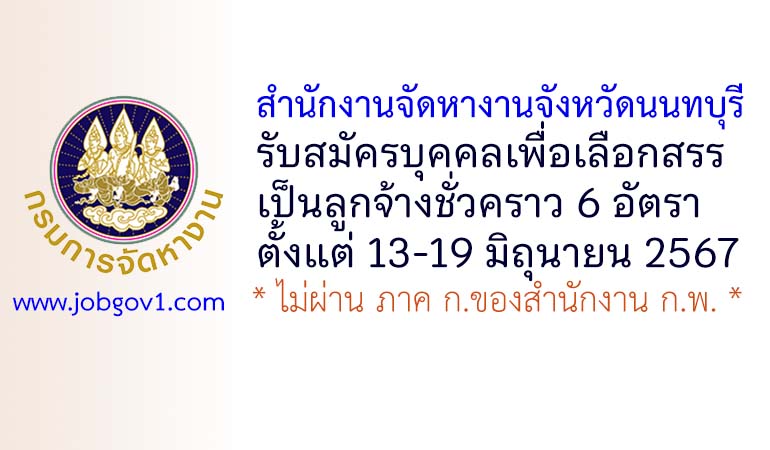 สำนักงานจัดหางานจังหวัดนนทบุรี รับสมัครบุคคลเพื่อเลือกสรรเป็นลูกจ้างชั่วคราว 6 อัตรา ตั้งแต่วันที่ 13-19 มิถุนายน 2567