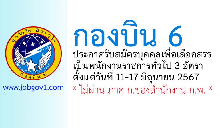 กองบิน 6 รับสมัครบุคคลเพื่อเลือกสรรเป็นพนักงานราชการทั่วไป 3 อัตรา ตั้งแต่วันที่ 11-17 มิถุนายน 2567